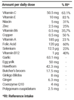 Magnesium L-lysinate, gelatine, ascorbic acid, garlic (Allium sativum), 4Life Transfer Factor™ (egg yolk), English hawthorn (Crataegus laevigata (Poir.) DC.), potassium citrate, d-alpha tocopheryl succinate, butcher’s broom (Ruscus aculeatus), zinc gluconate, magnesium L-ascorbate, water, Ginkgo biloba L., beta-carotene, ginger (Zingiber officinale Roscoe), niacinamide, copper glycinate, coenzyme Q10, L-selenomethionine, Japanese knotweed (Polygonum cuspidatum), L-ascorbyl-6-palmitate, folic acid, pyridoxine hydrochloride, and cyanocobalamin.
