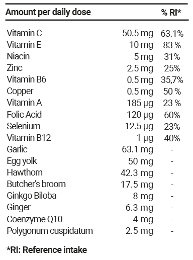 Garlic supports normal cholesterol levels and blood circulation in the legs. Ginger supports vascular health and immune health. Hawthorn and Ginkgo biloba supports blood circulation and blood circulation in the legs. Japanese knotweed has antioxidant properties (it contains resveratrol). Butcher’s broom supports blood circulation and vascular health. -