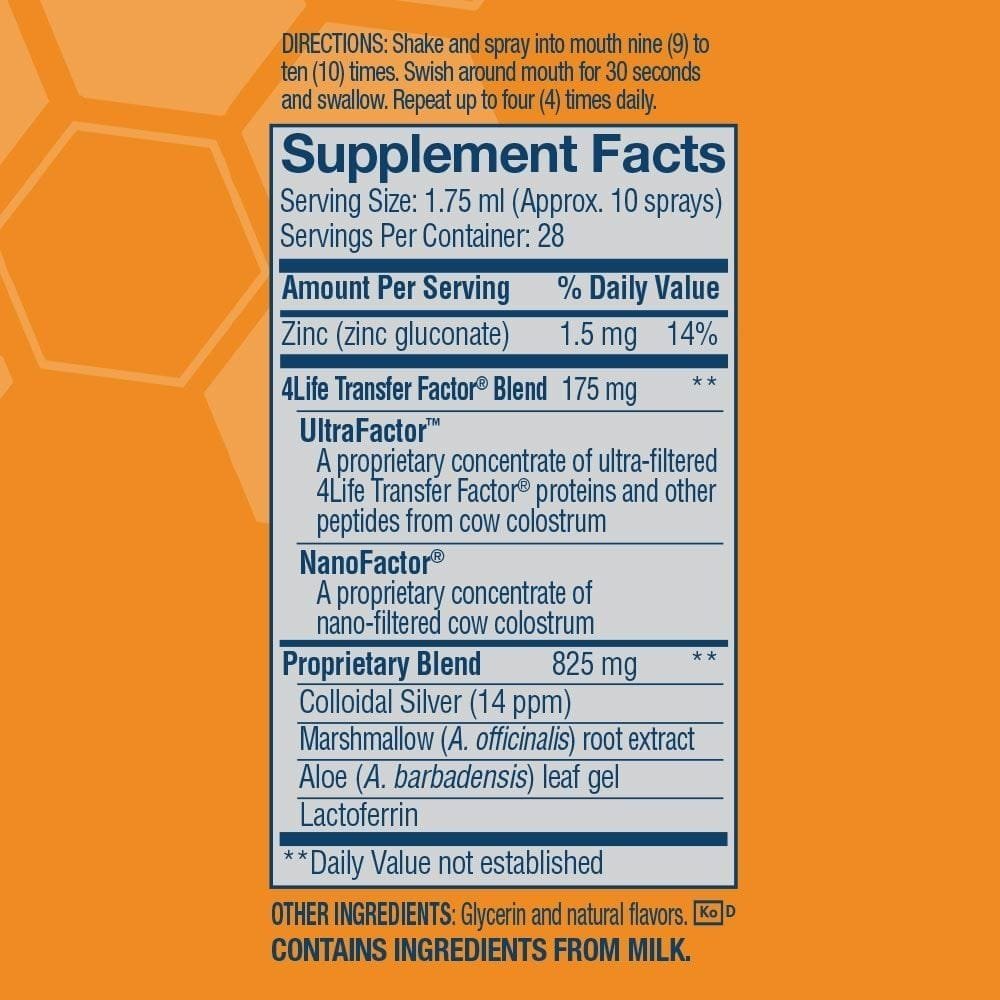 4Life Transfer Factor Immune Spray combines the immune-boosting power of UltraFactor and NanoFactor extracts with additional ingredients that promote immune system function, including colloidal silver, zinc, and lactoferrin. This easy-to-dispense throat spray also contains soothing aloe vera and marshmallow*